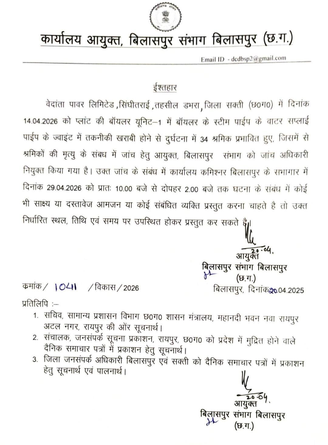 वेेदांता पावर लिमिटेड प्लांट दुर्घटना की उच्च स्तरीय जांच—29 अप्रैल को आमजन से साक्ष्य एवं दस्तावेज आमंत्रित