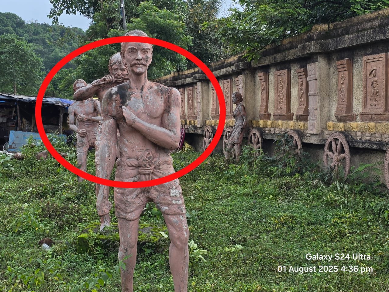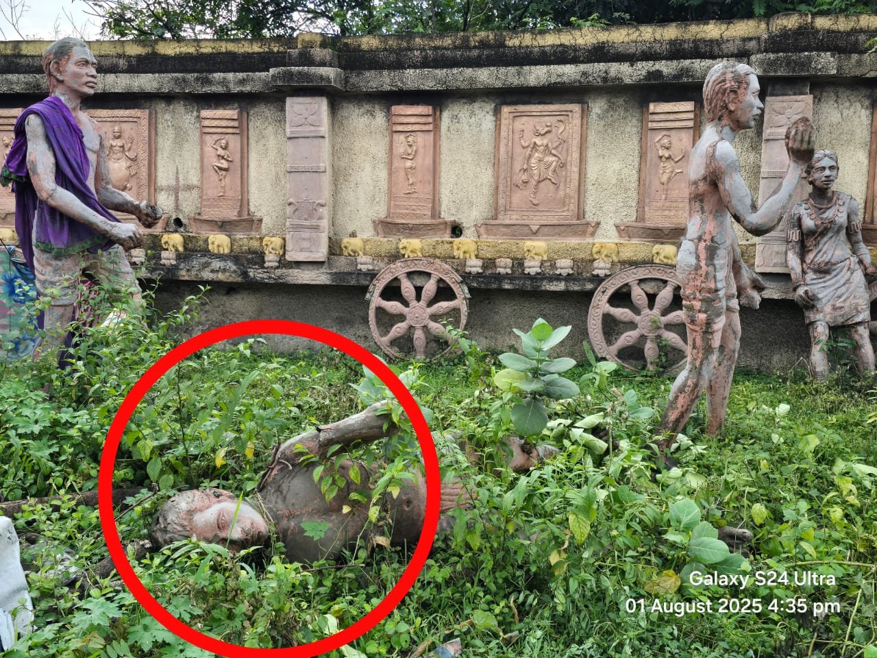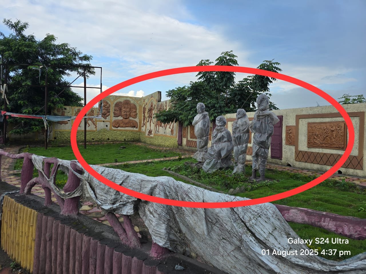 वही दूसरी तरफ एक और तस्वीर सामने आई है जहां इसी स्थान के ठीक सामने सौंदर्यीकरण का नया कार्य किया जा रहा है। यहां सौंदर्यीकरण में एक बार फिर मूर्तियां लगाई गई है जिसका अनावरण शायद होना है, यही कारण है कि इन मूर्तियों को पॉलिथीन लगाकर ढका गया है।