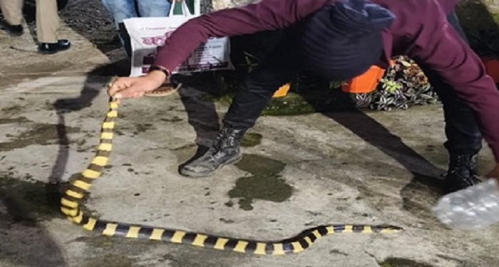 वहीं दूसरी घटना सोमवार के शाम को ही सामने आए जहां कटघोरा थाना परिसर में पुलिस कर्मियों के कॉलोनी में एक पुलिस कर्मी के घर लगभग 7 फीट का इलाज देखने से हड़कंप मच गया सांप घर के आंगन में गमले किनारे कुंडली मार बैठा हुआ था अचानक लाइट चालू करने पर सांप पर नजर पड़ी जहां काले और पीले रंग चमकदार सांप देखने से घर वाले घर से भाग खड़े हुए और इसकी सूचना अन्य लोगों को जहां मौके पर रेस्क्यू कर उसे सुरक्षित जंगल में छोड़ा गया तब जाकर लोगों ने राहत की सांस ली। बताया जा रहा है कि कटघोरा थाना परिसर में एक के बाद एक सांप निकालने की घटना सामने आ रही है इससे कालोनी वासी भयभीत है।