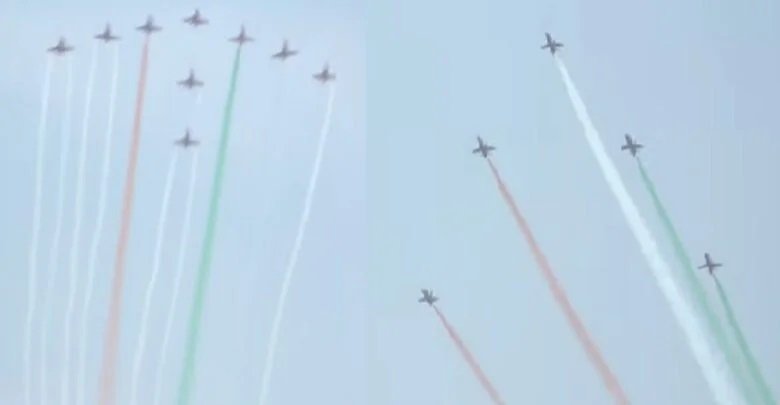 रायपुर : छत्तीसगढ़ राज्योत्सव 2025 का आज अंतिम दिन है। इस मौक पर नवा रायपुर में भारतीय वायुसेना की सूर्यकिरण एयरोबेटिक टीम और आकाश गंगा पैराट्रूपर टीम नवा रायपुर के आसमान में अपने अद्भुत करतबों का प्रदर्शन किया। सेंध तालाब के ऊपर हुए एयर शो में 9 हॉक एमके-132 फाइटर जेट्स ने एक साथ उड़ान भरते हुए ‘तिरंगा’, ‘हार्ट इन द स्काई’ और ‘एरोहेड’, डायमंड, लूप, ग्रोवर, डान आदि परफॉर्मेंस आकाश में दिखाई दिए । इसके साथ ही आसमान में तिरंगा भी लहराया गया।